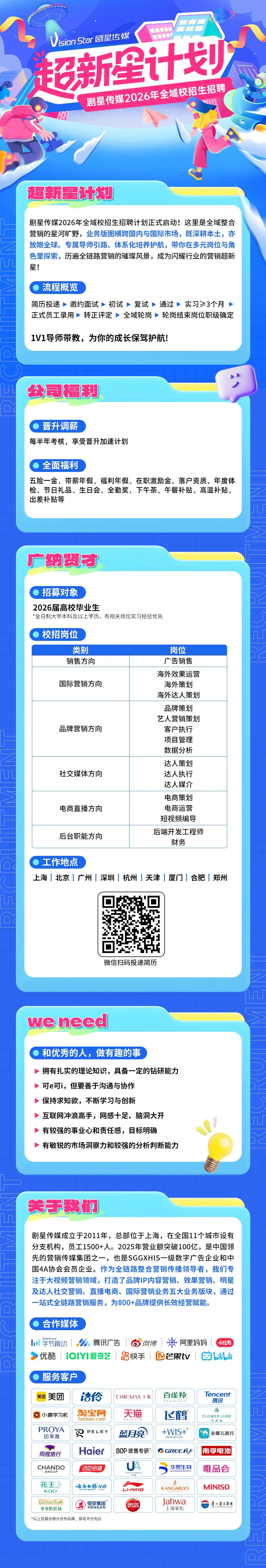 春日焕新,新星登场。剧星传媒2026年春季校招计划正式启动!以年轻热忱破界,以鲜活创意发声,这里是广告人的浪漫疆域,更是新生代的逐梦舞台。不做星空下的仰望者,只做自己主场的造浪者。我们在此岸呼唤潮汐,等你以一声响亮的回响,掀起属于自己的巨浪!