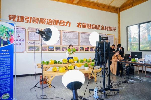 在墨江县曼海创业村落,主播正在直播销售佛手、香橼