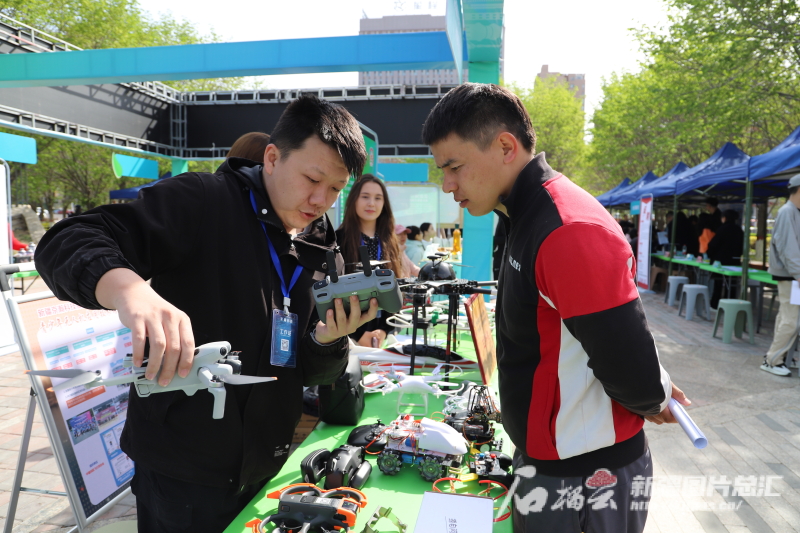 4月18日上午,2025年自治区退役军人(军属)专场招聘活动中,新疆京瀚科技服务有限责任公司工作人员向求职的退役军人做无人机产品展示。夏华广 摄